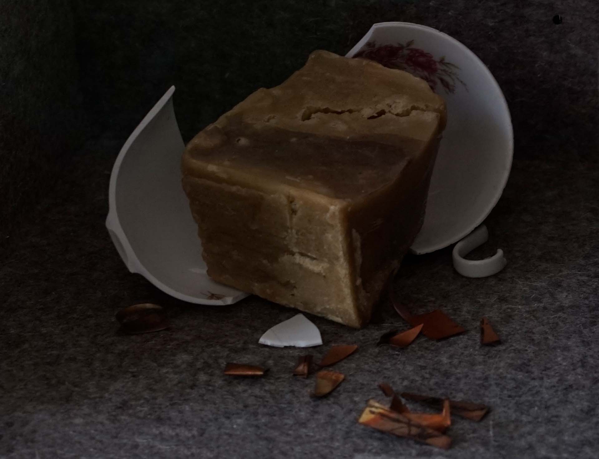 Wooden Box, Felt, Wax, Copper, Broken Cup, Glass, Text, 28 x 31 x 31 cm