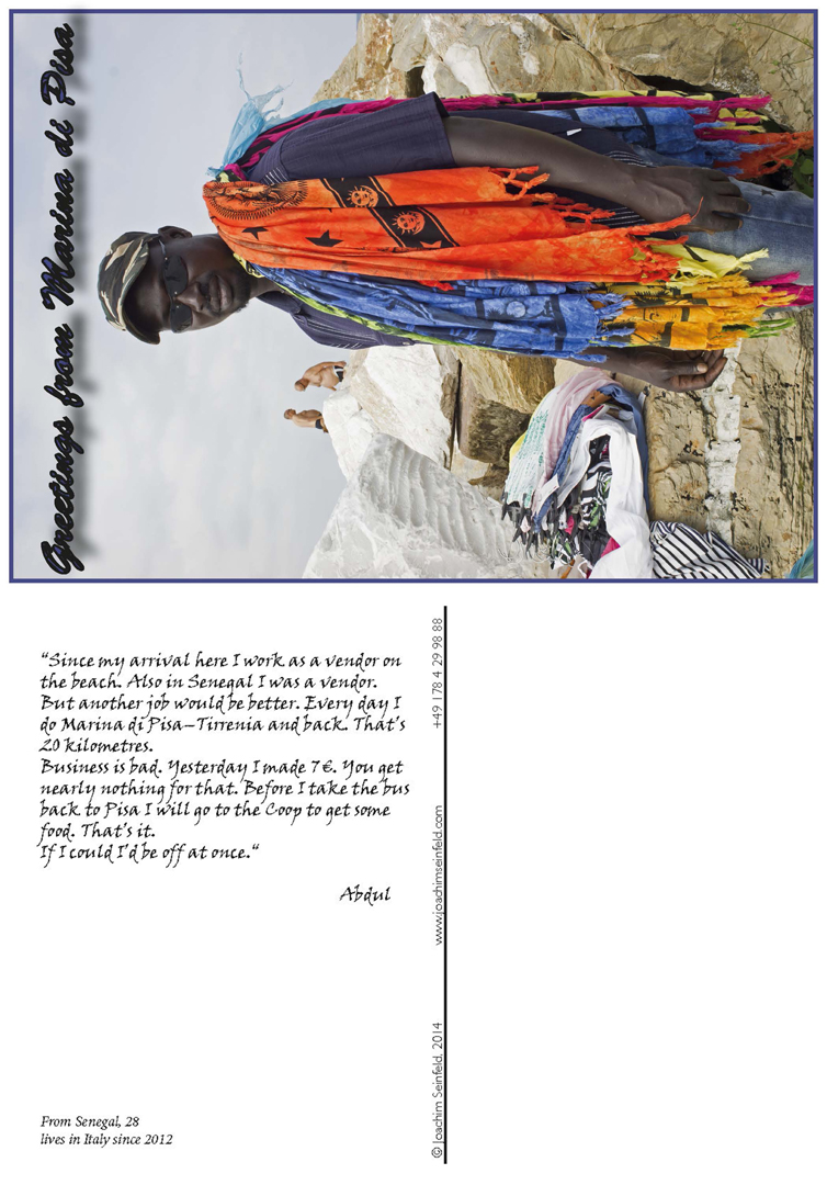 #3 – Abdul, English version, from the series Vucumprà, colour digital photography and text on postcard, 2014