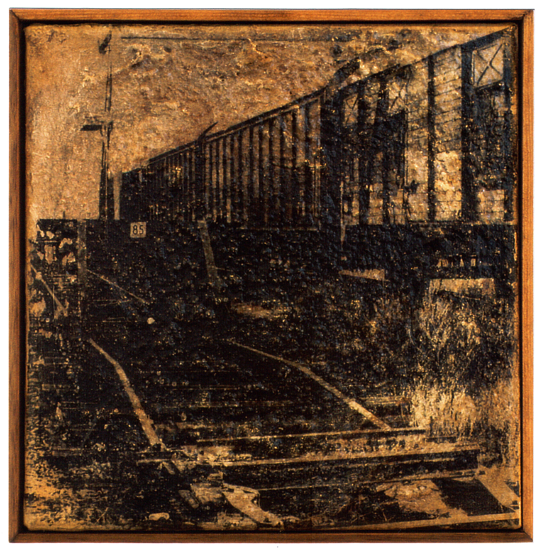 Abtransport (Deportation) 1993, Silver Gelatine (applied by hand) on Acrylic Painting on Canvas, 20 x 20 cm