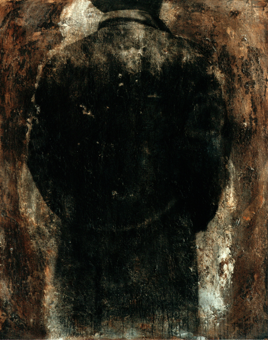 Dunkelmann-Bystander II, 1992/94, Silver Gelatine (applied by hand) on Acrylic Painting, Clay and Mordent on Plywood, 120 x 80 cm