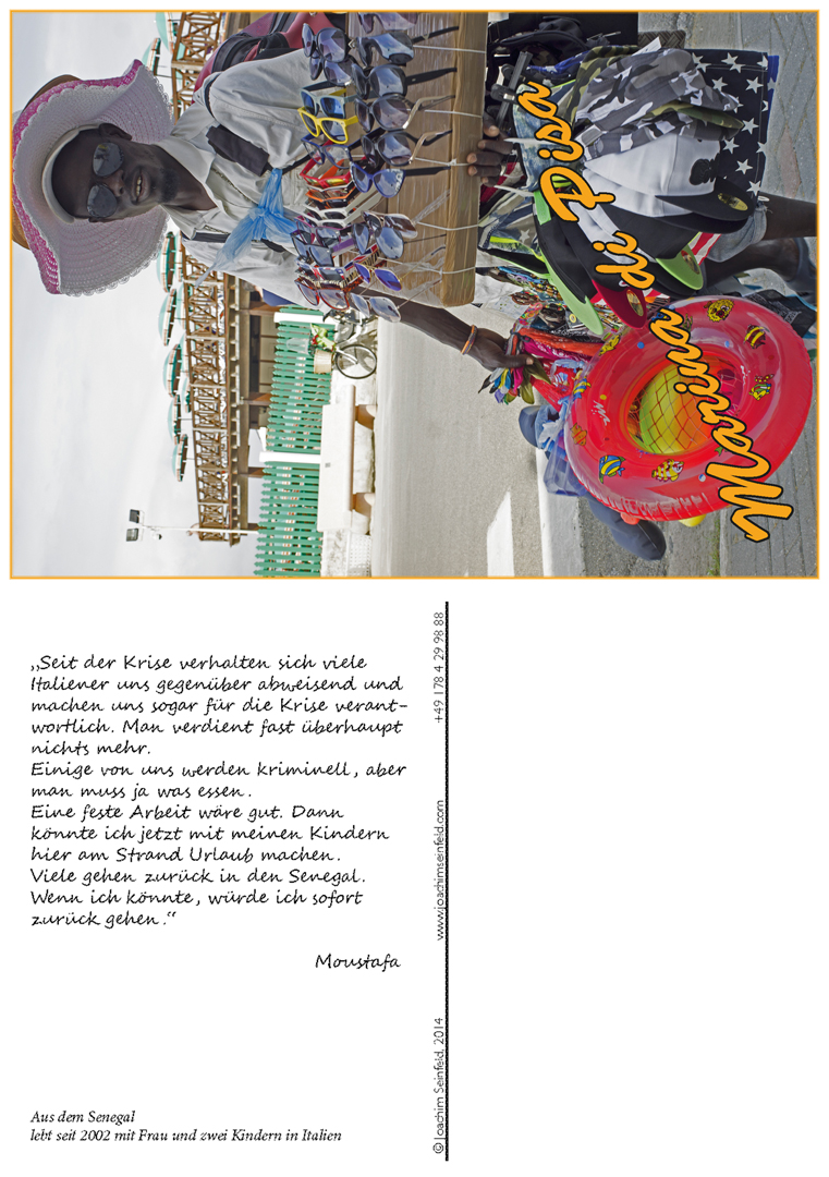 #1 – Moustafa, German version, from the series Vucumprà, colour digital photography and text on postcard, 2014